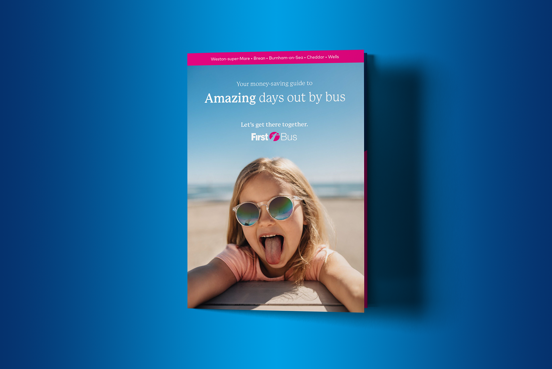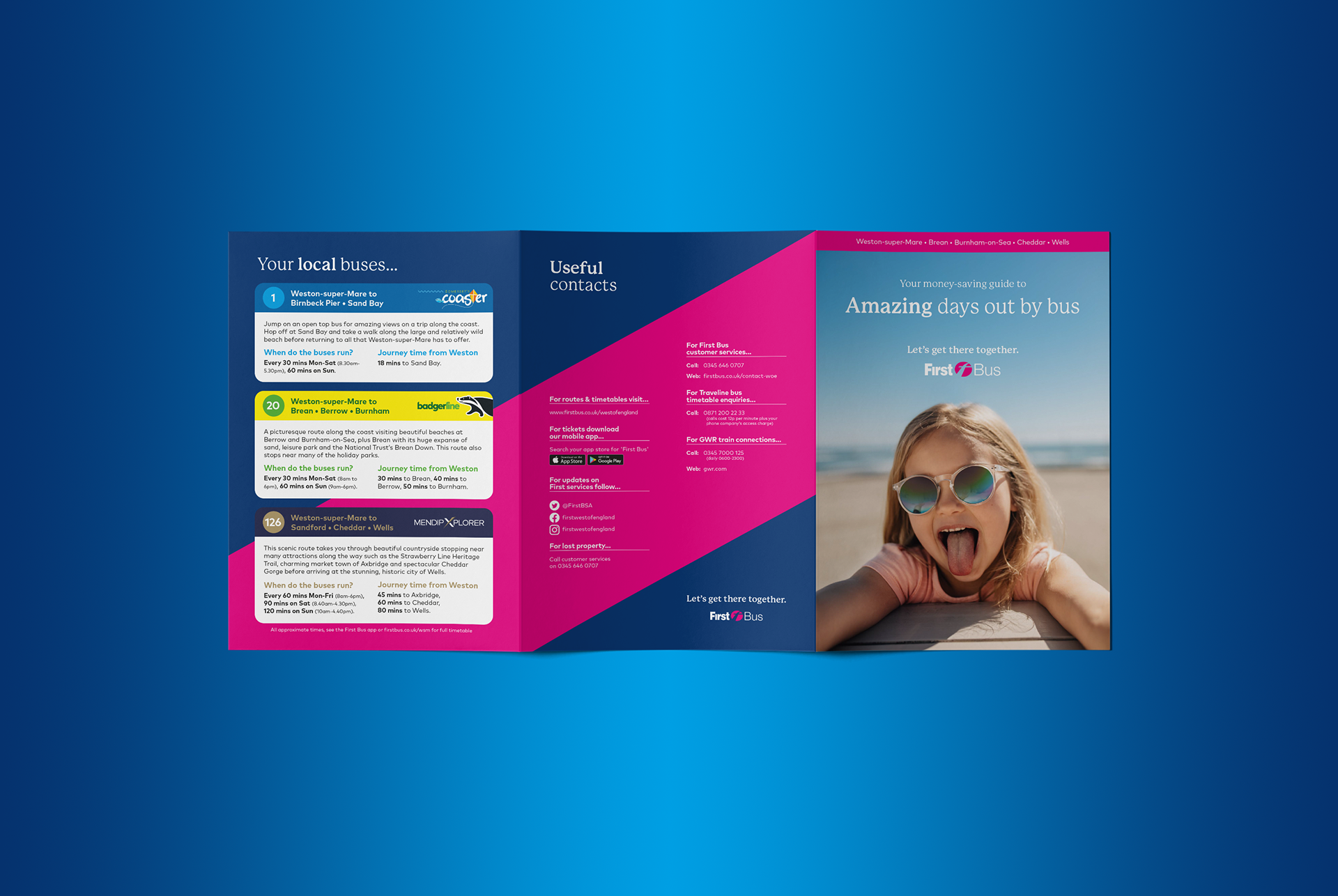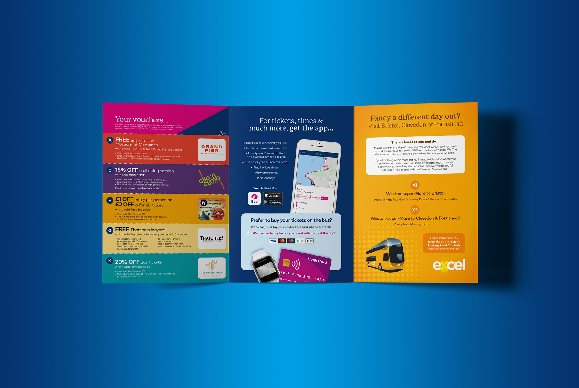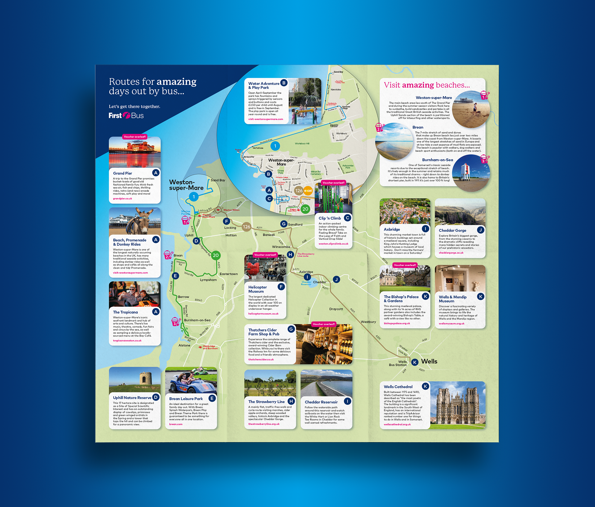 A fun eye-catching leaflet for First Bus to promote their three tourist routes from Weston-super-Mare. The leaflet includes service and attraction information along with money-saving vouchers and a handy map. It will be distributed in and around Weston, in holiday parks, attractions etc and encourage people to go for a day out on the bus.