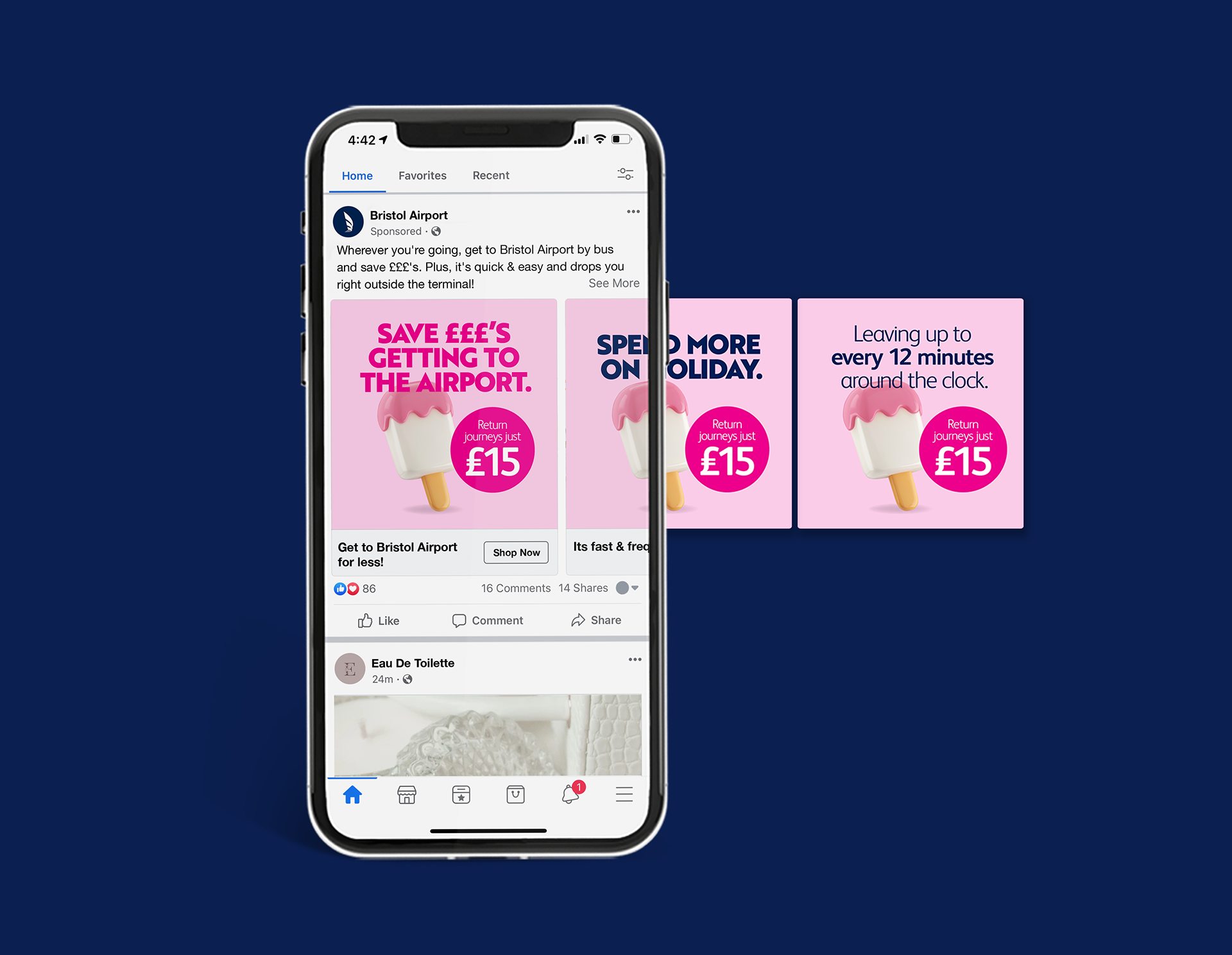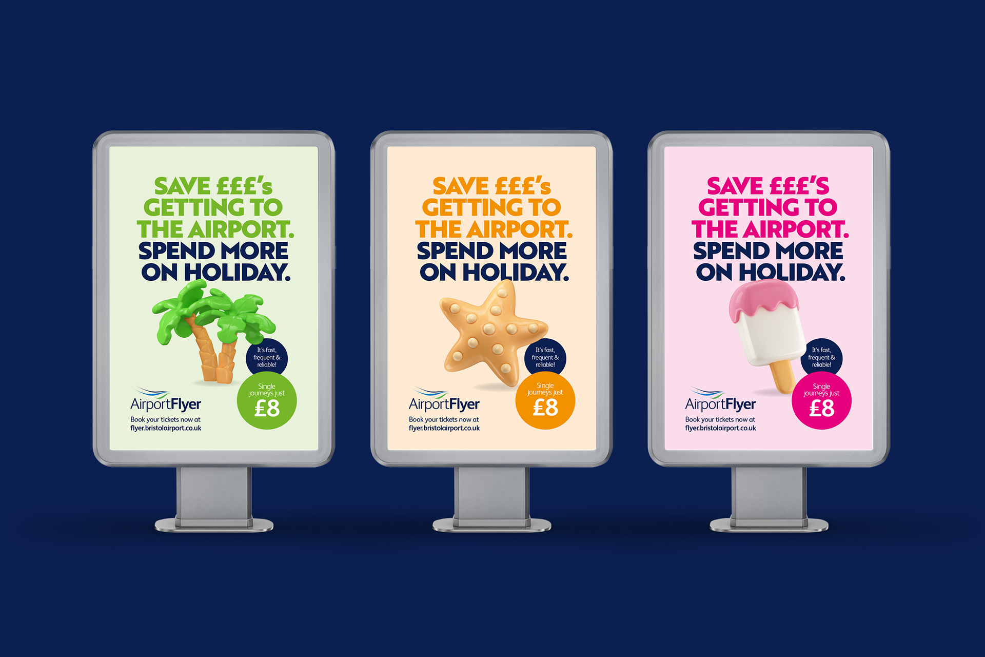 Save £££'s getting to the airport. Spend more on Holiday! Our highly successful digital and print campaign to promote the Airport Flyer bus to Bristol Airport uses bright colours and fun imagery to highlight this great value service.