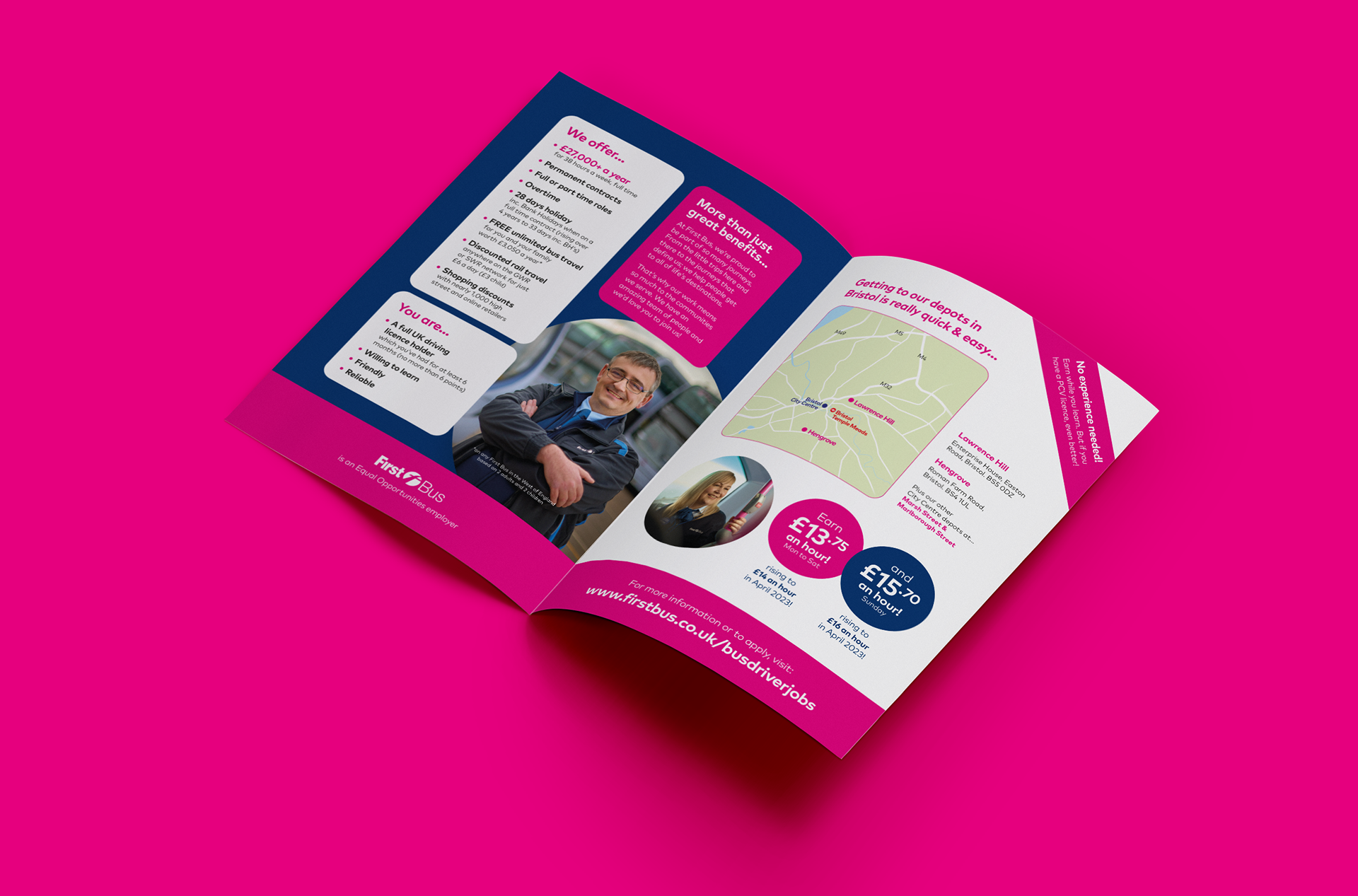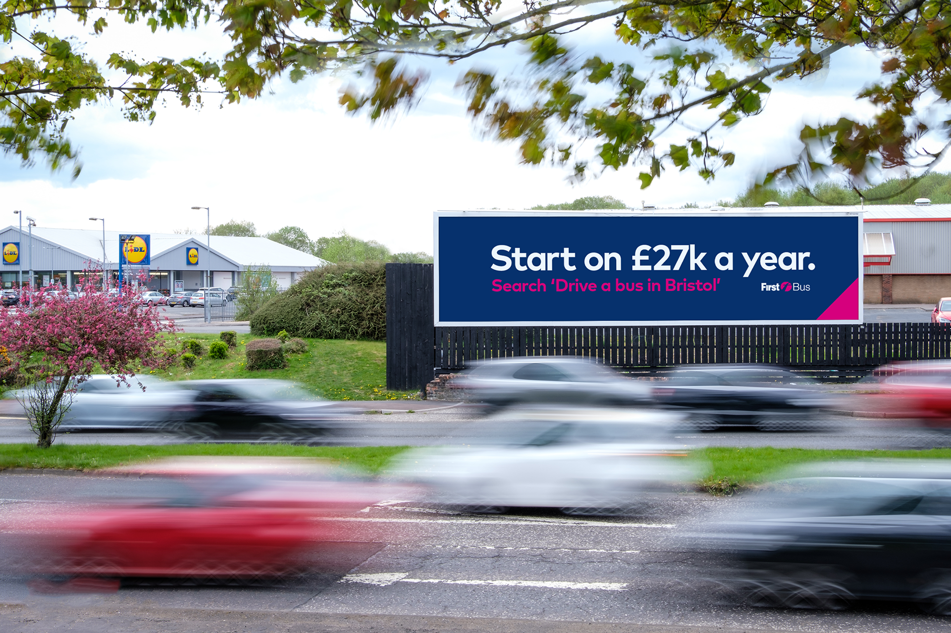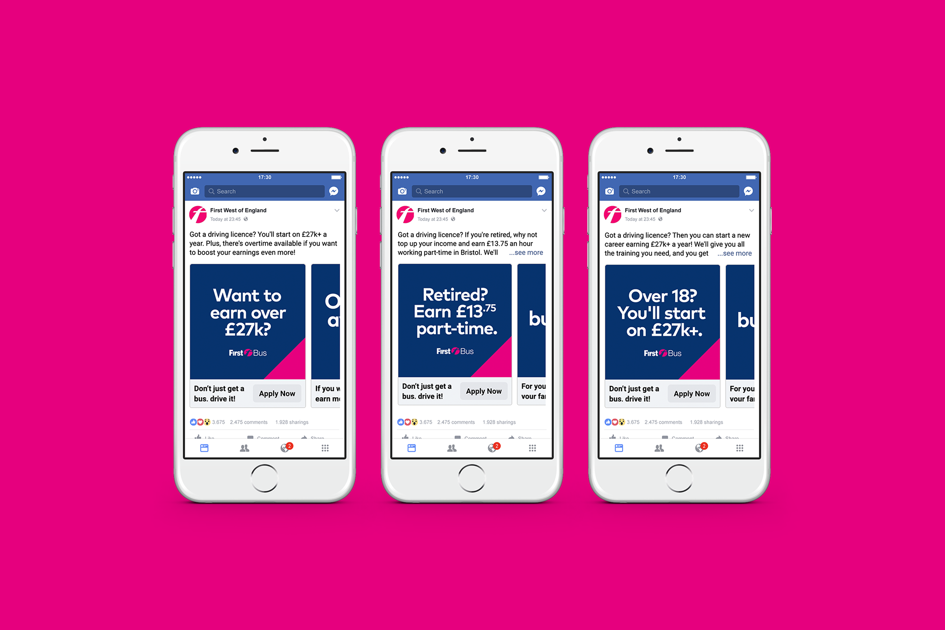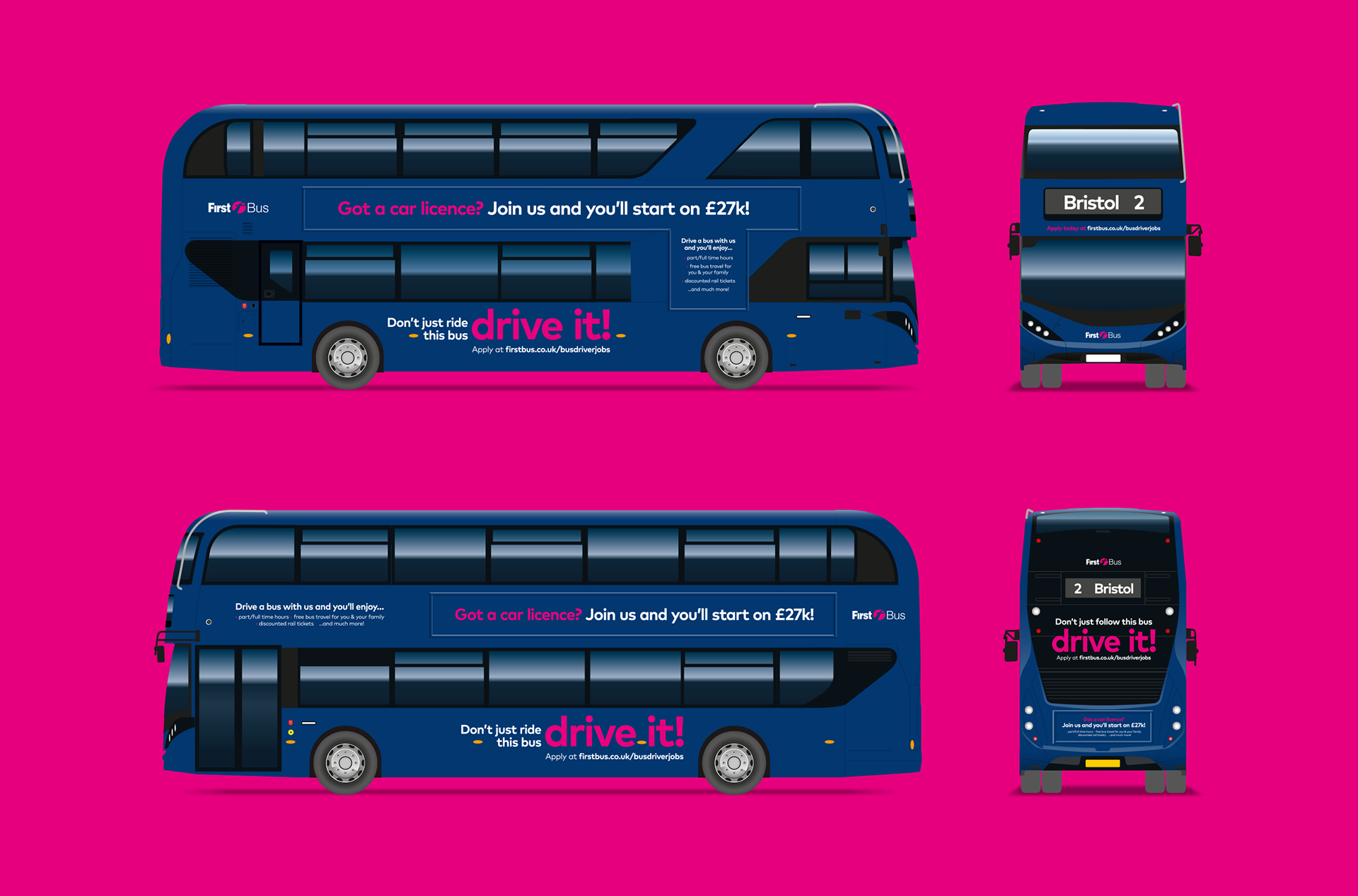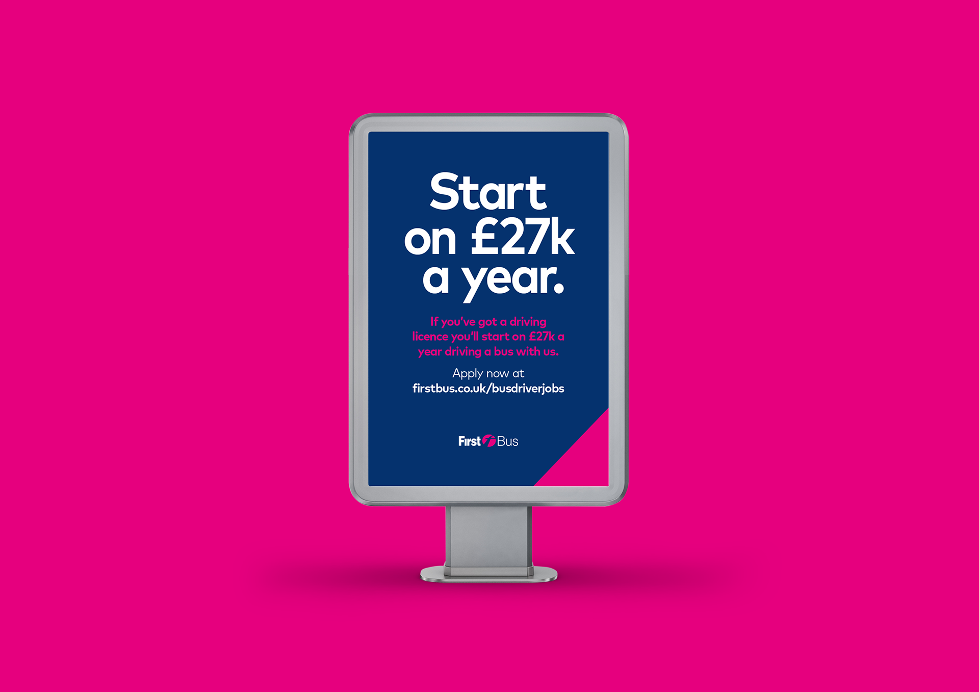 Driver recruitment is the main problem currently facing the bus industry. To combat this, First in the West Of England asked us to devise a campaign to help out. We wanted to highlight the fact that, no matter who you are, if you're over 18 and have a driver's licence, you can start on £27k+ a year! Simple and proving to be very effective.