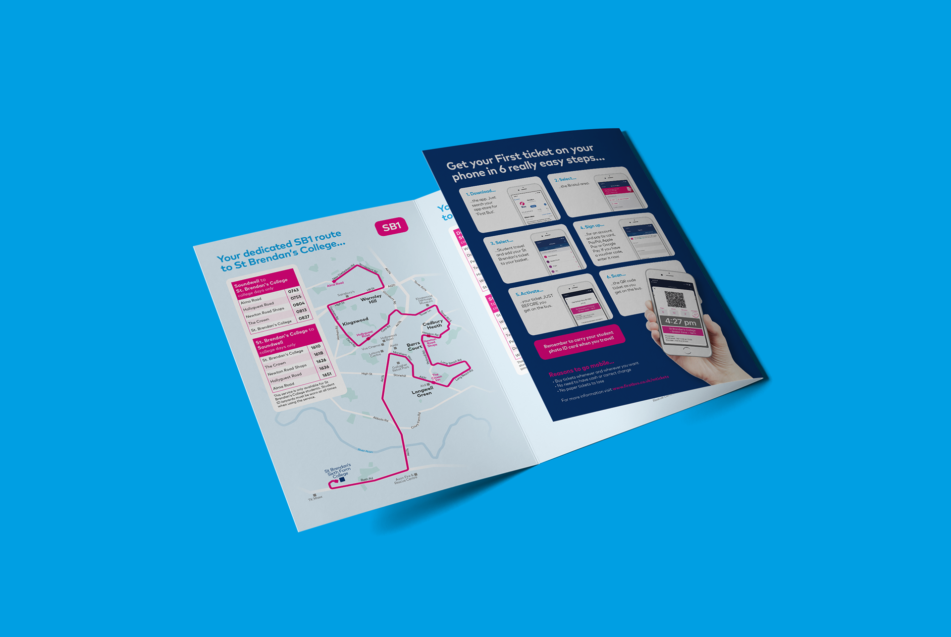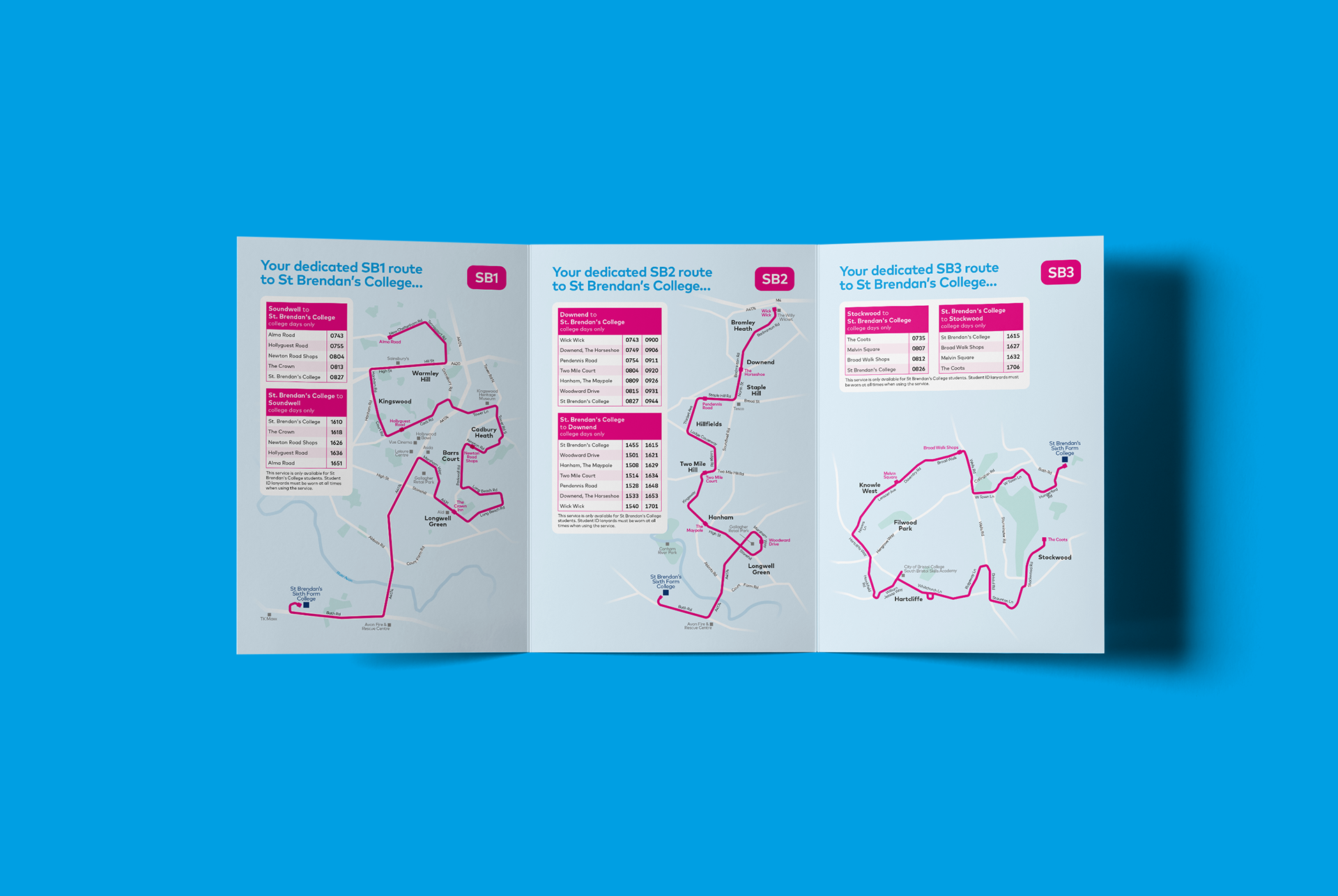 Design of a simple leaflet of college bus services for First in Bristol. Including timetables and custom route maps.