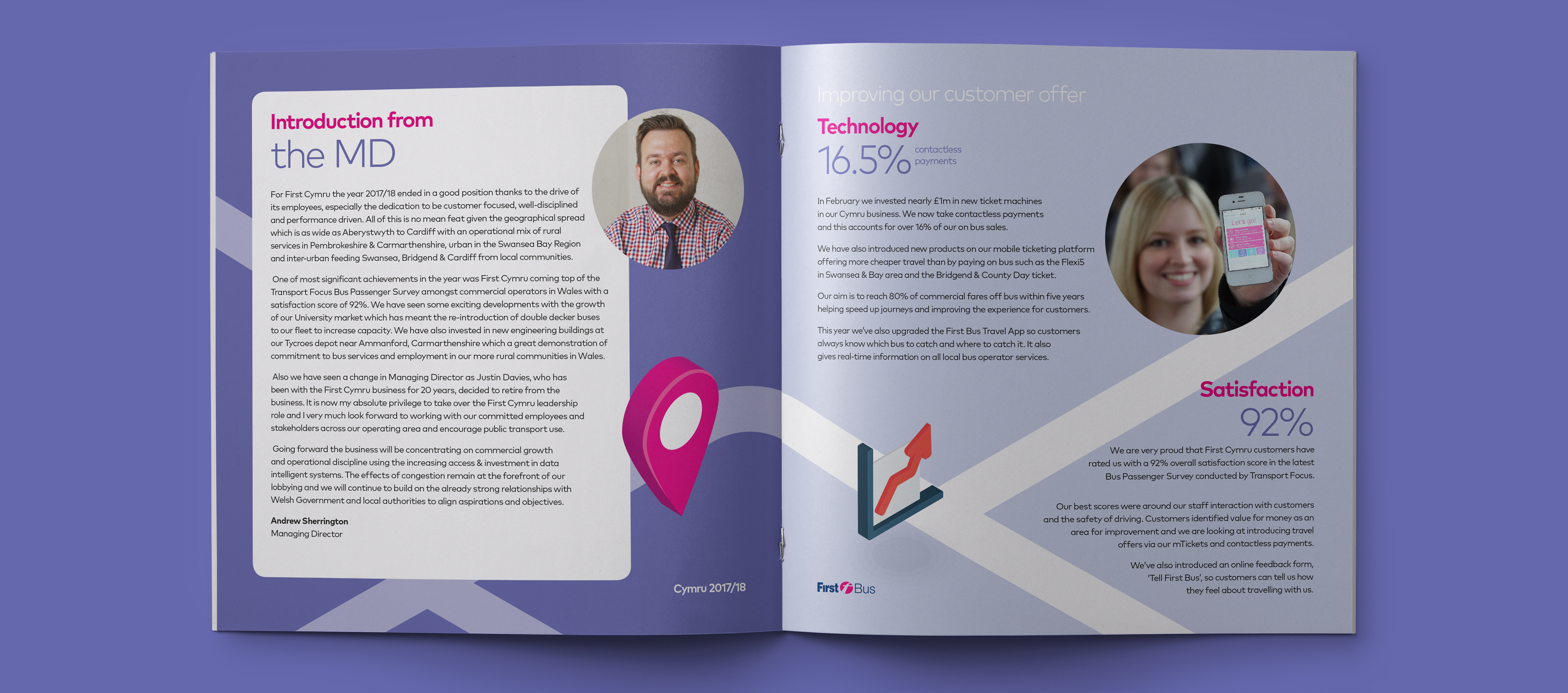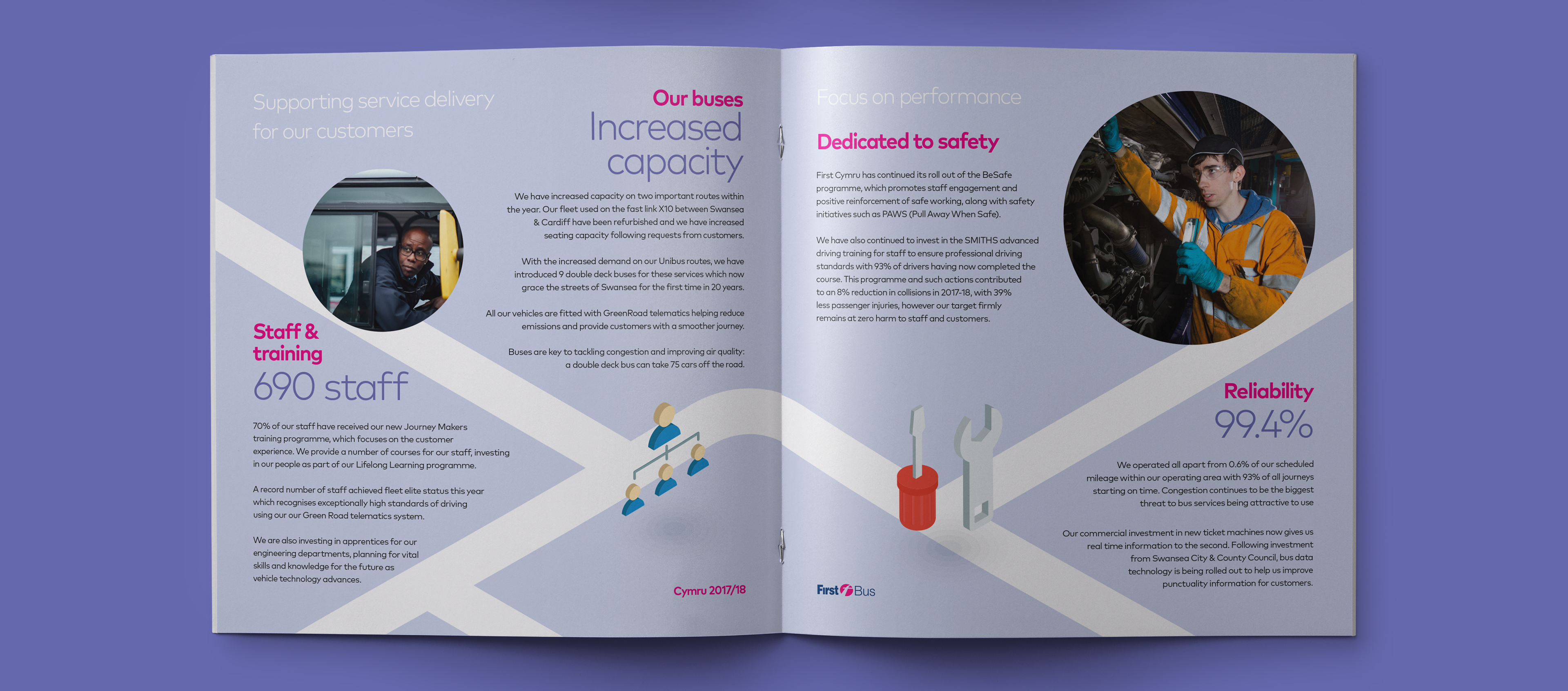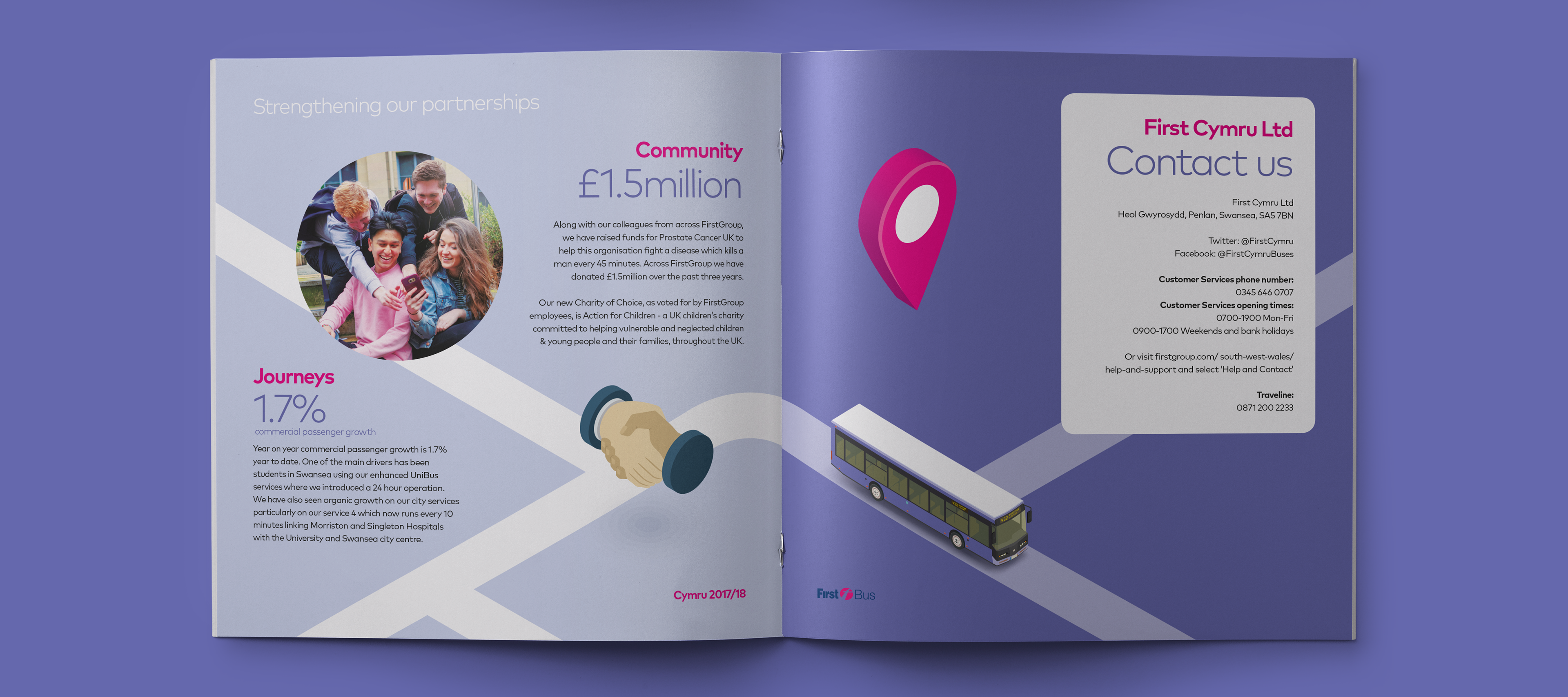We were commissioned to design a template that First could use to create a set of annual reports for various areas around the UK. We came up with a simple, clean and modern design to make it easy for anyone to see the good work going on around the country.