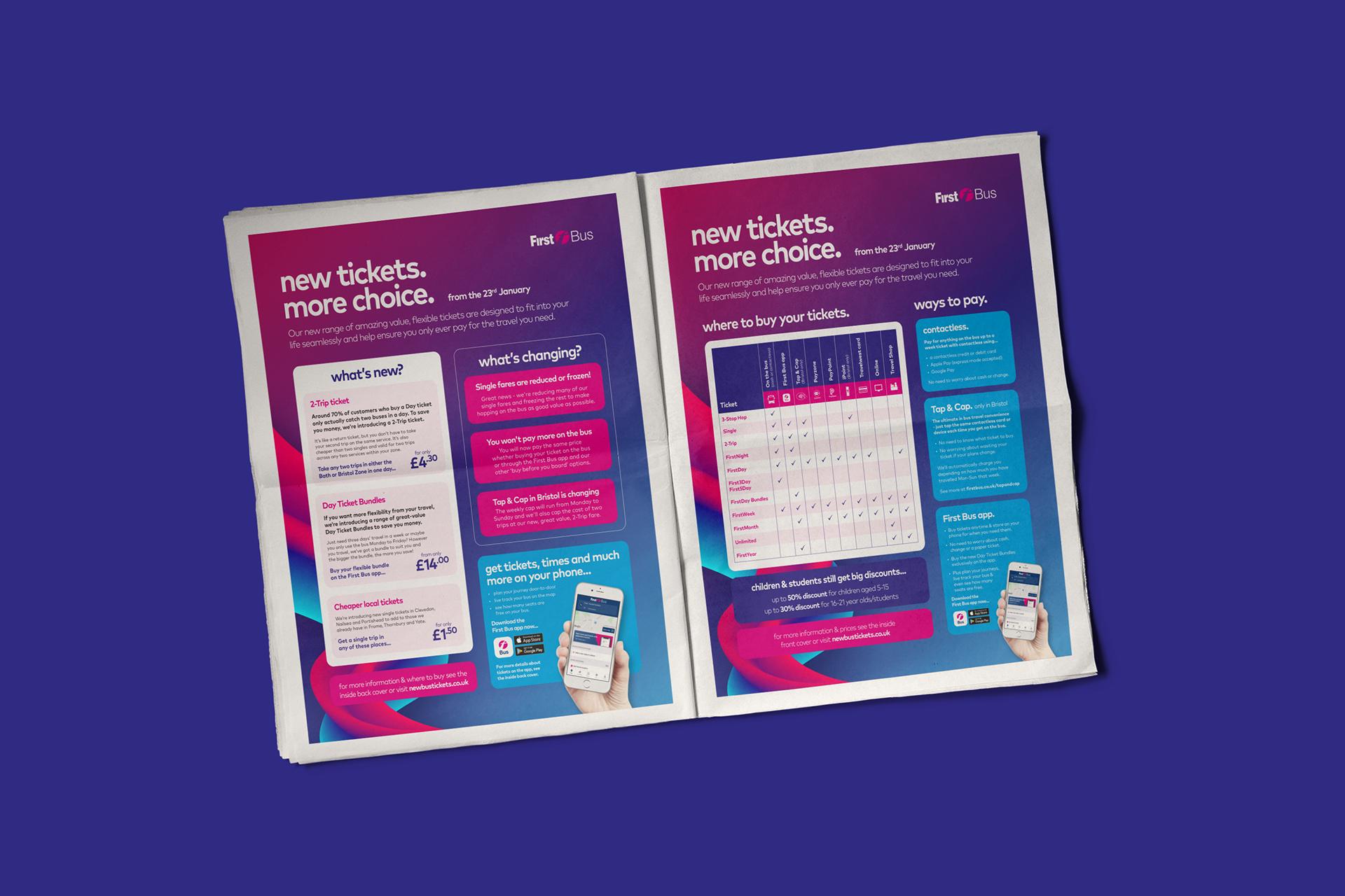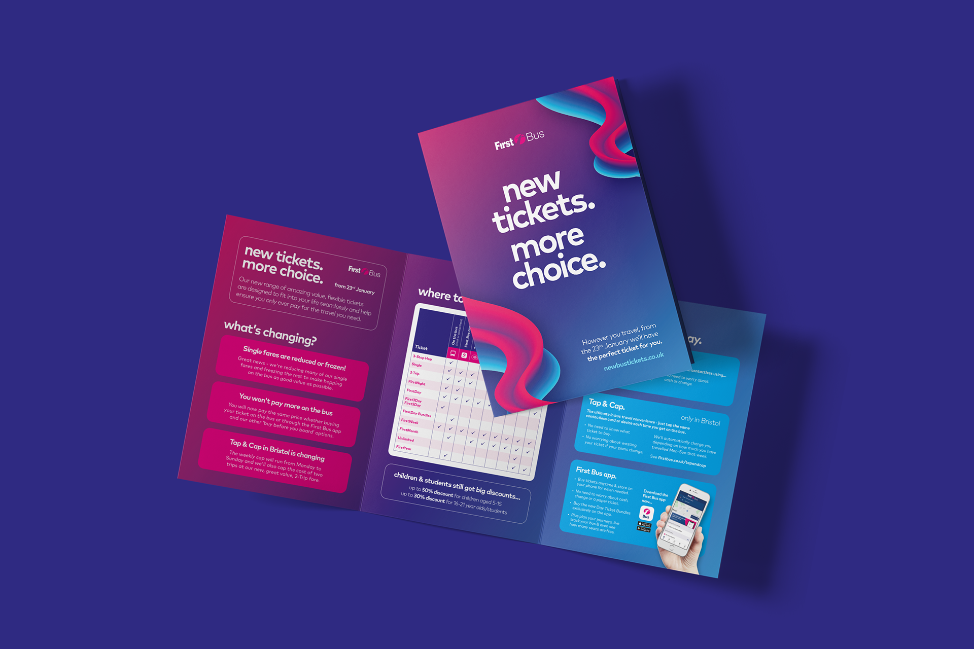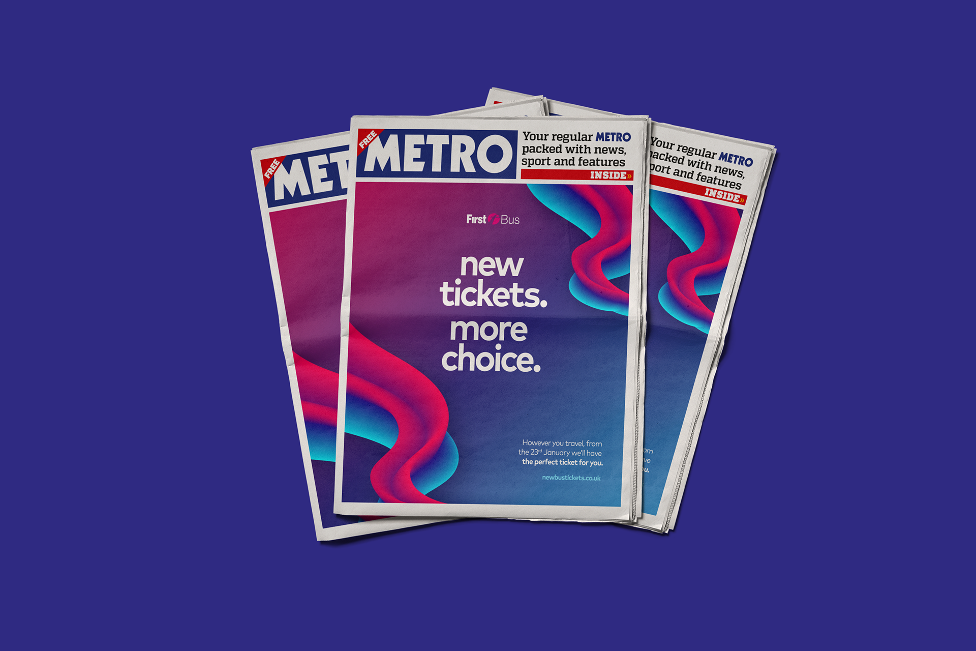 The way people travel by bus has changed and First in the West of England wanted their tickets to reflect this. So they asked us to promote the launch of their new range of tickets. We obliged and created a simple, eye-catching campaign to do just that. New tickets. More choice.