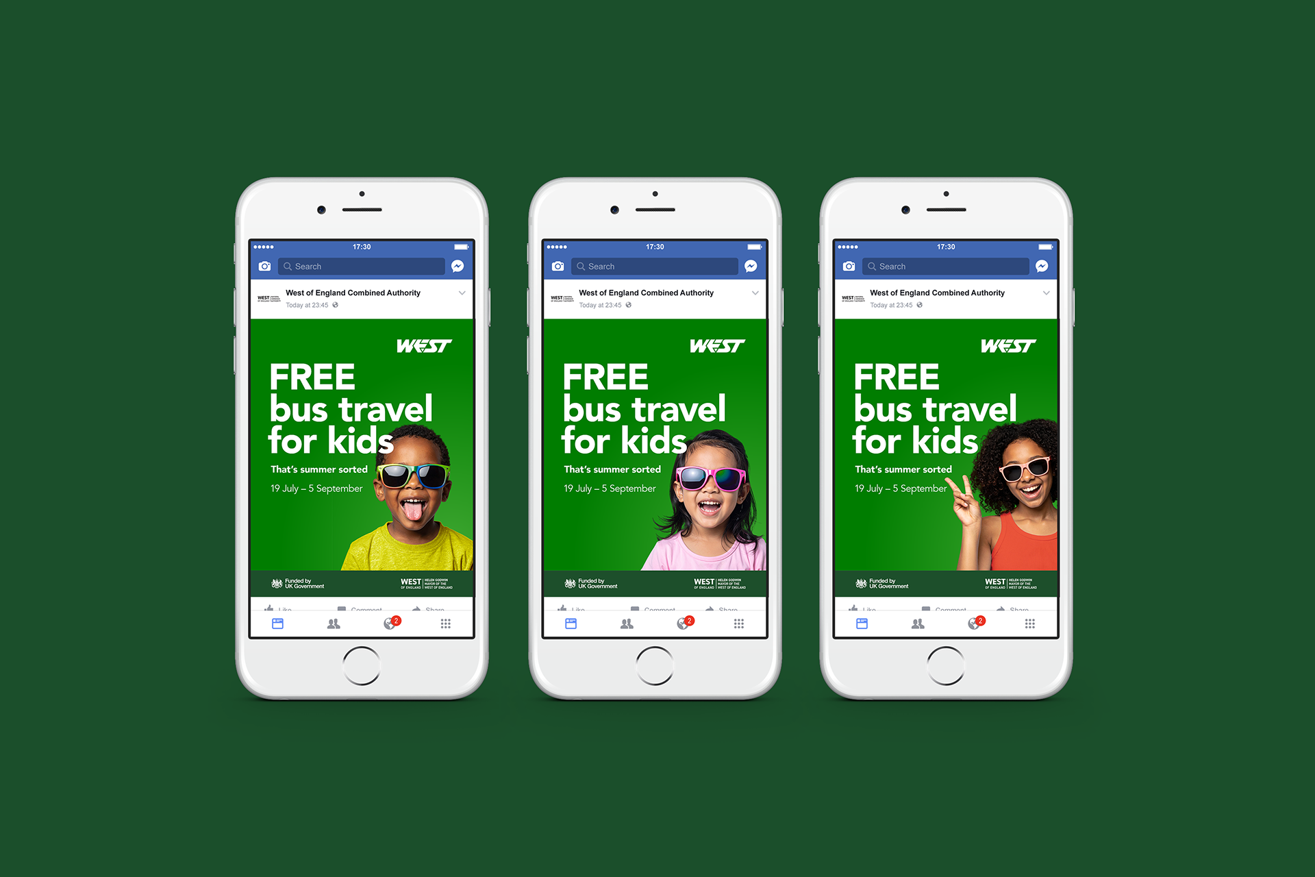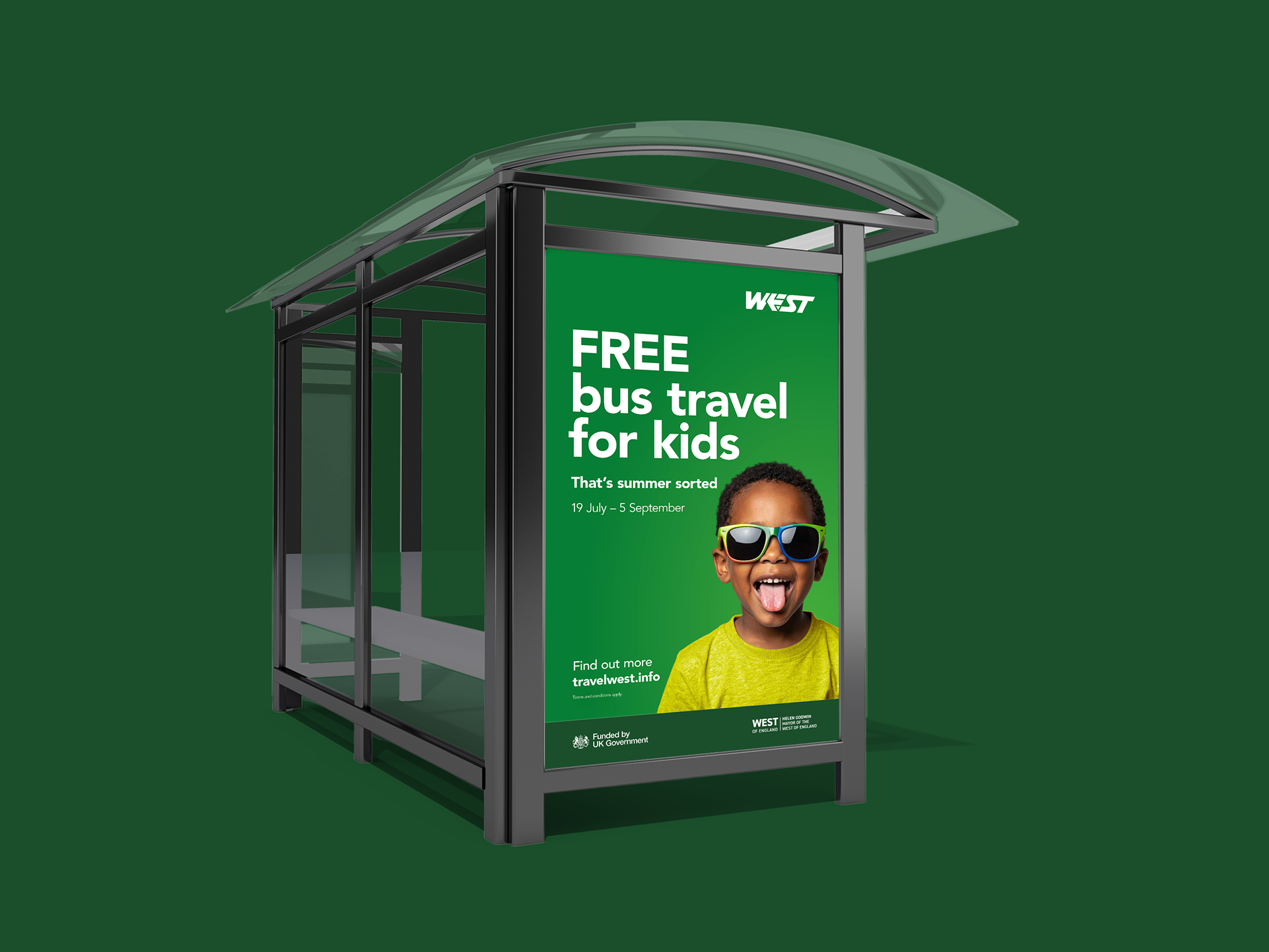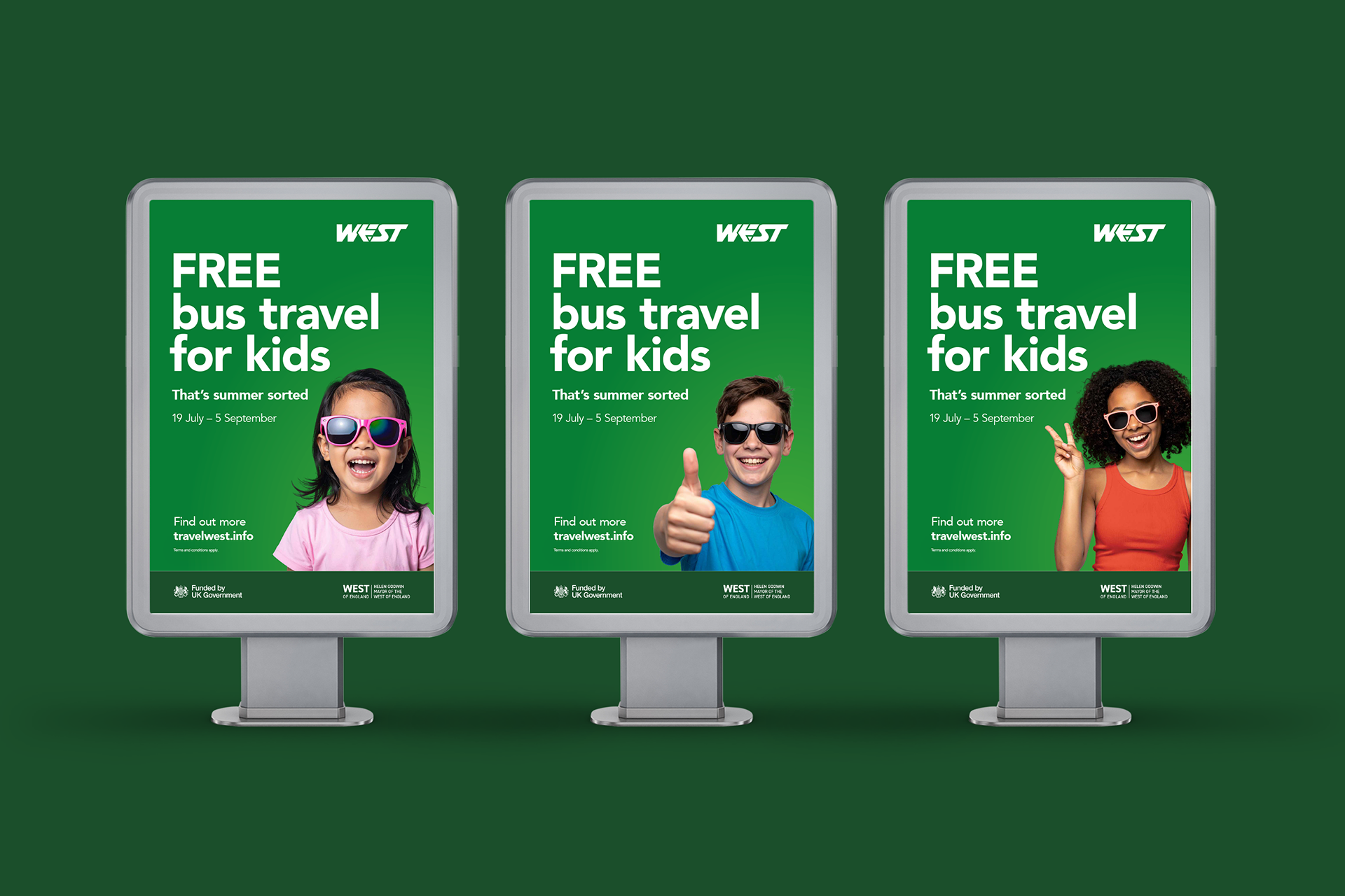 A campaign to communicate a relatively simple offer (under 16s travel free on local buses throughout the summer holidays) - working within the client’s strict brand guidelines to achieve sign-off from the numerous stakeholders. The key to the creative approach was to make it visually engaging through the use of the client’s corporate colours, working alongside a series of portrait images – two targeting parents and two targeting older children. The sunglasses alluded to the time of year and added a subtle touch of humour. The campaign included extensive digital executions (Meta, digital display, 6/48 sheets), posters, and promotional material, alongside working with First Bus on their own deliverables.