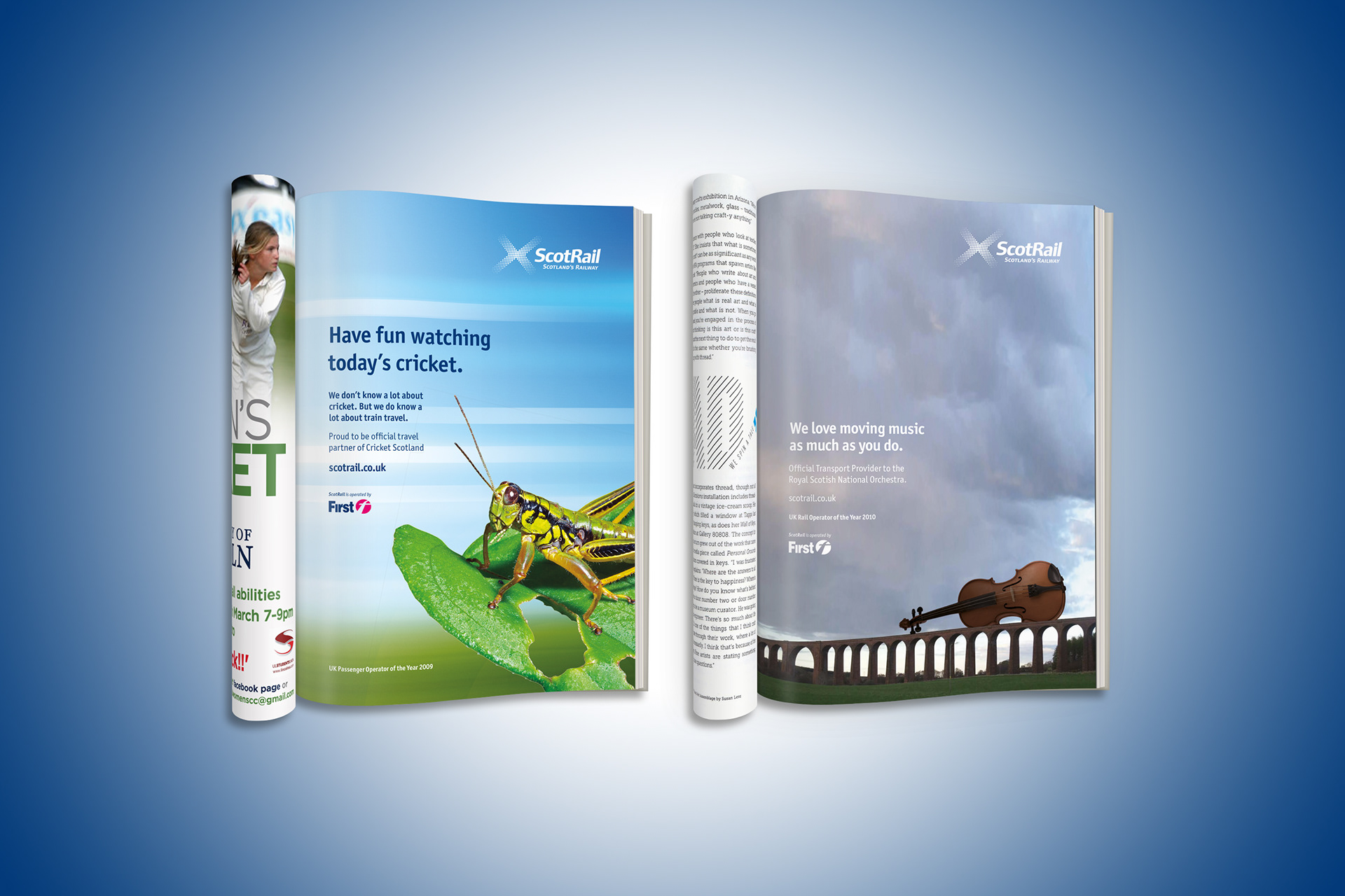 A series of adverts to promote ScotRail's sponsorship of the Royal Scotish National Orchestra and Cricket Scotland