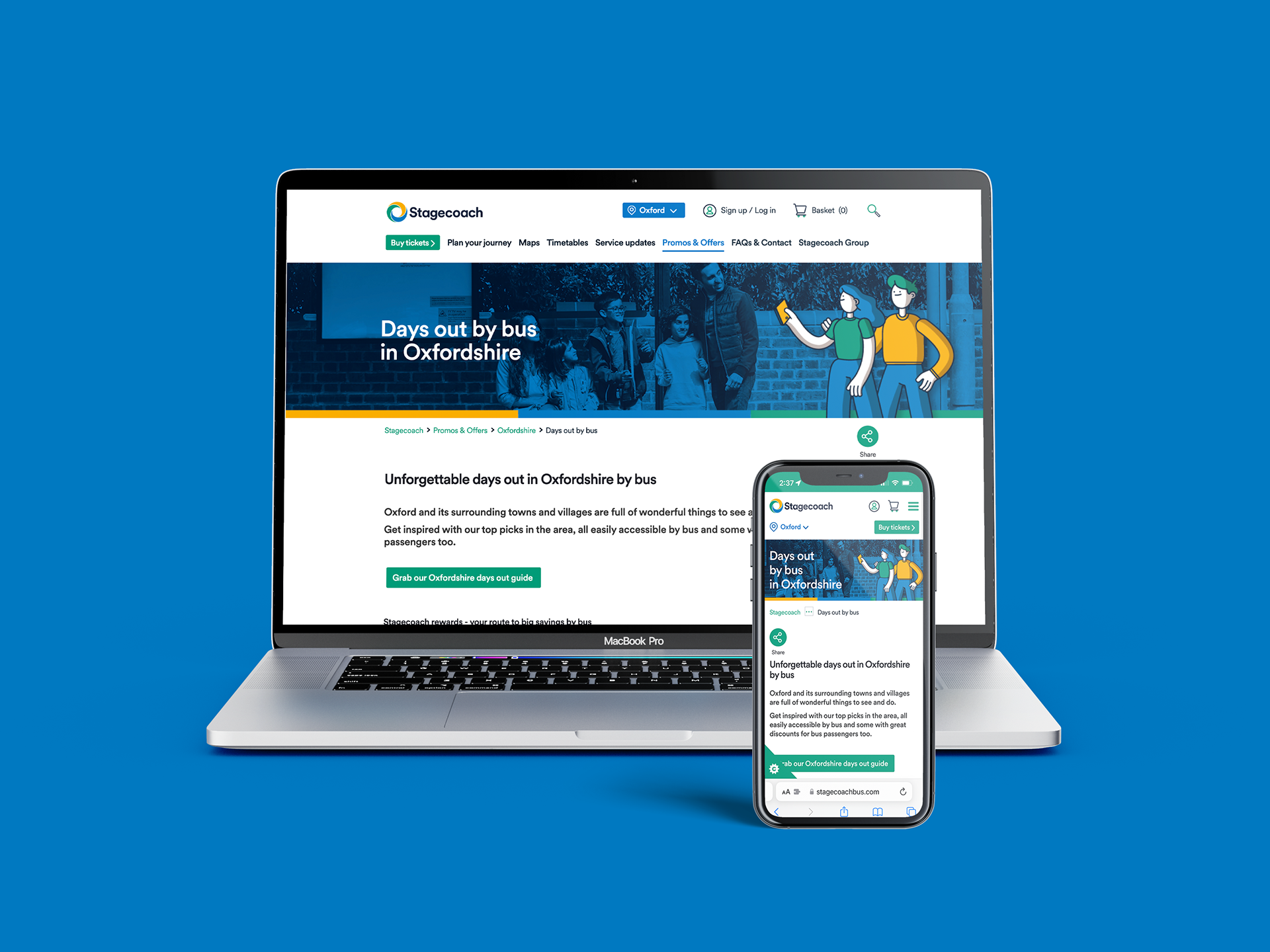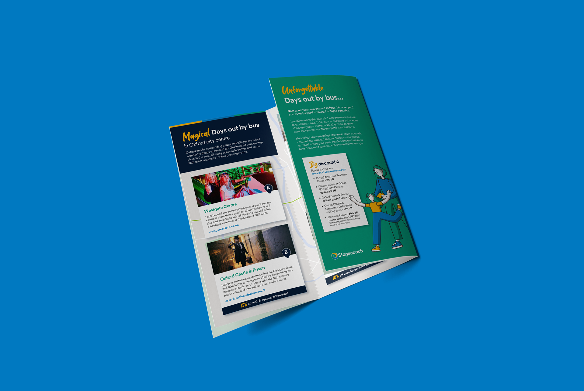 We were asked by Stagecoach to produce a printed visually enticing guide that would encourage residents and visitors to use local buses to travel to points of interest in and around Oxford. The guide would be supported with a campaign of digital display and Facebook adverts, encouraging clicks to a landing page that hosted the leaflet. It would also be distributed to hotels, tourist information hubs, libraries, and schools.