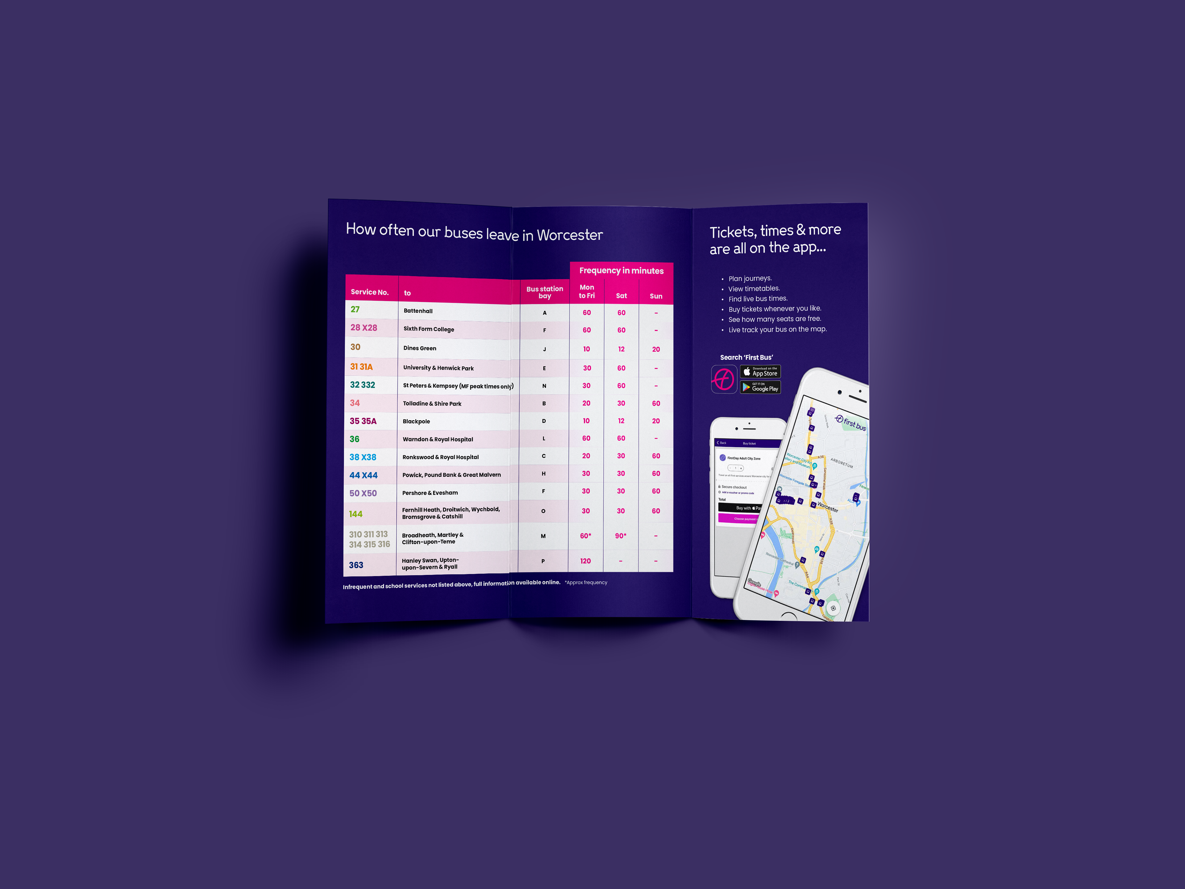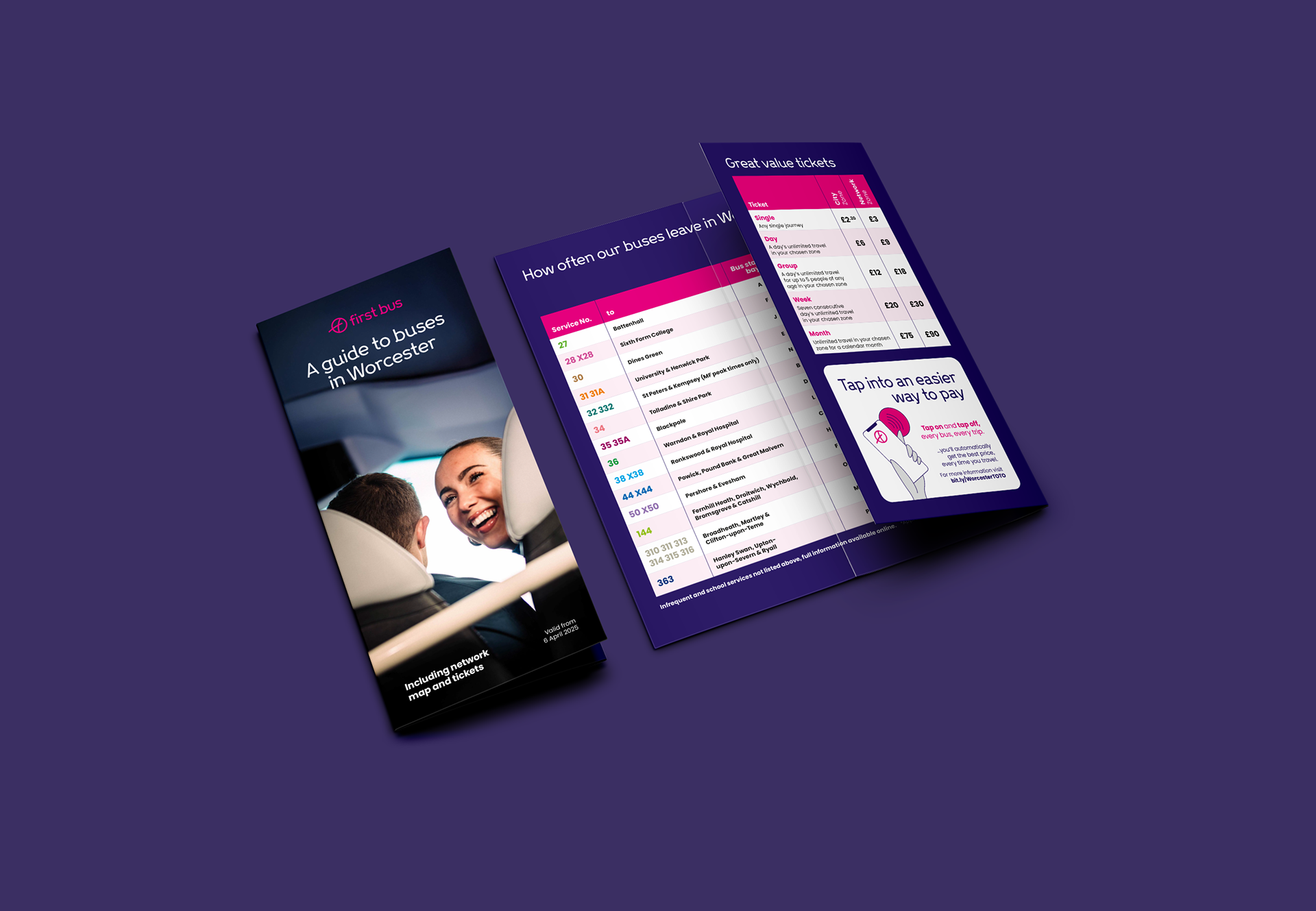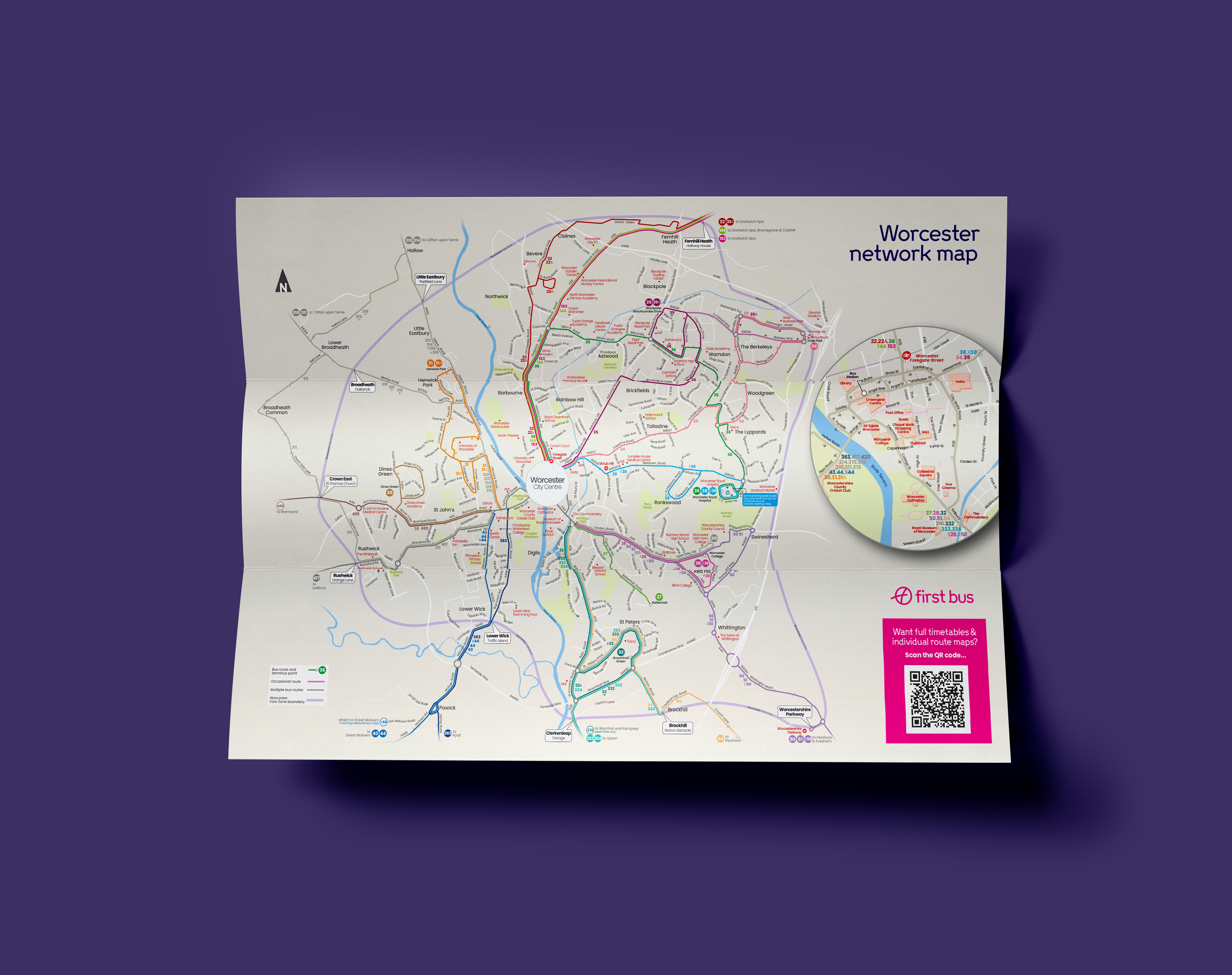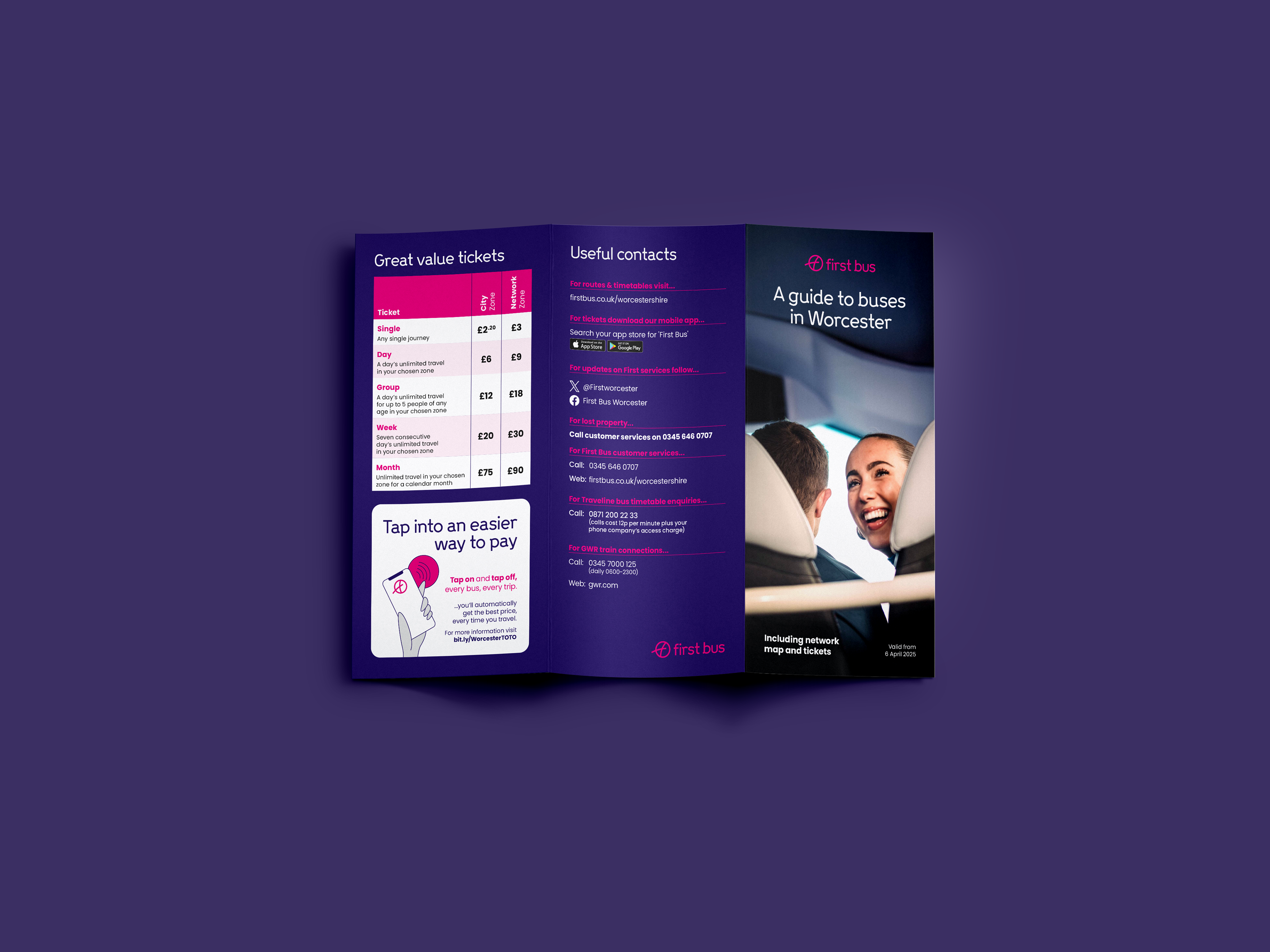 A printed guide to First Bus services in Worcester, including tickets, a frequency guide and a network map.